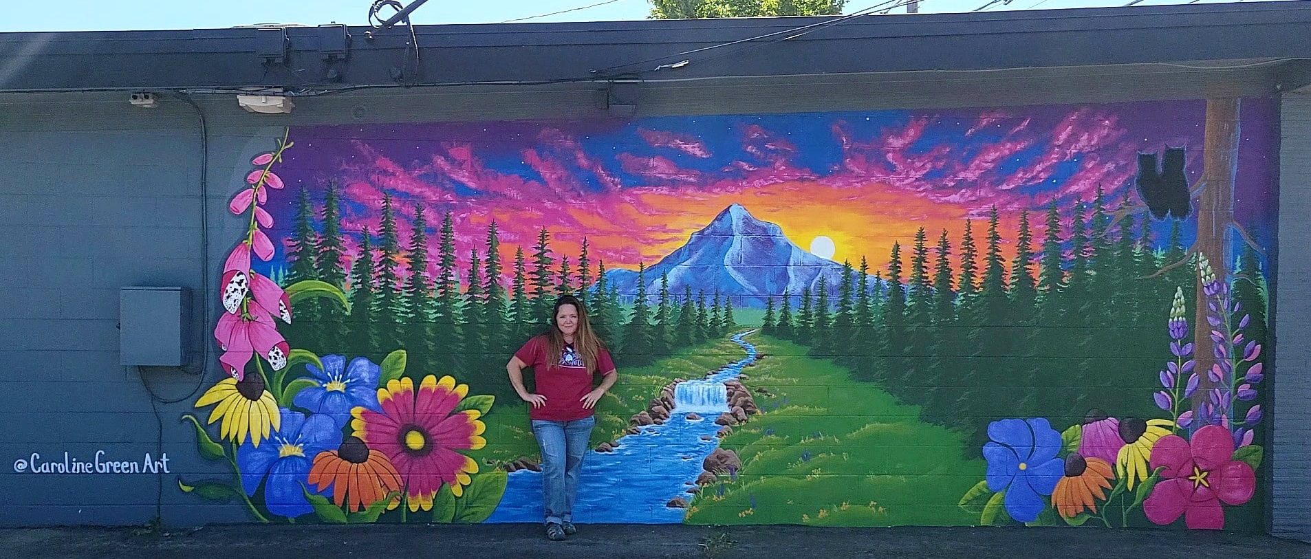 What I specialize in: I specialize in large-scale, atmospheric landscapes inspired by the Pacific Northwest. I use a specific glazing technique with oils and acrylics to create deep, saturated colors that make a space feel immersive. My style is often described as ‘whimsical realism’—whether I’m working on a 25-foot mural of Mt. Hood or a tiny, detailed pet portrait on birch wood, the goal is to create a dream-like version of the world we live in.